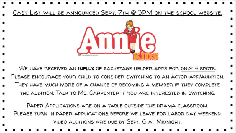 It's time to audition for the MES Drama Club Production of Annie Kids. Applications are available outside of the drama room beginning August 23rd. Please read the application carefully. All applications & video auditions are due by September 6th at midnight. Results will be posted on the school website on September 7th. We have received an influx of backstage helper applications for only four spots. Please encourage your child to consider switching to an actor app/audition. Talk to Ms. Carpenter if you are interested in switching. #MESdrama #MESrocks