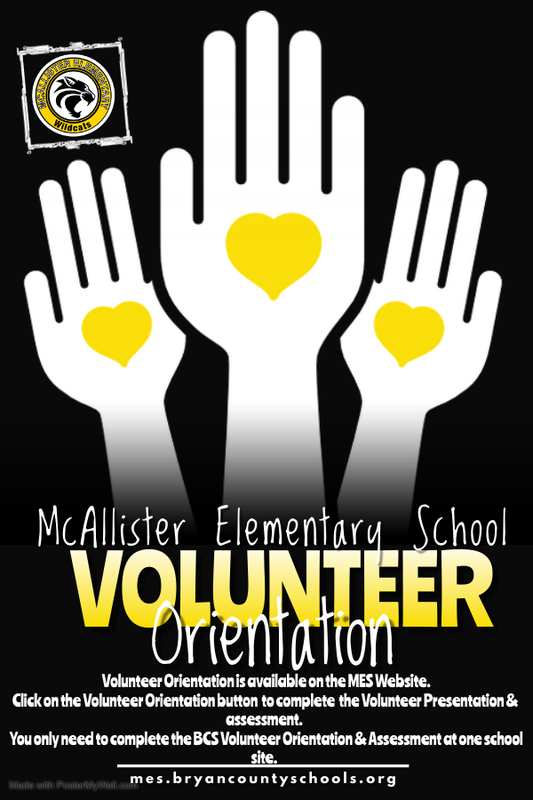 Are you interested in volunteering at MES? All volunteers in the school building must complete a mandatory volunteer orientation and complete a volunteer assessment. The volunteer orientation presentation and assessment link are available on the MES webpage. Click the Volunteer Orientation button on our homepage - https://mes.bryancountyschools...